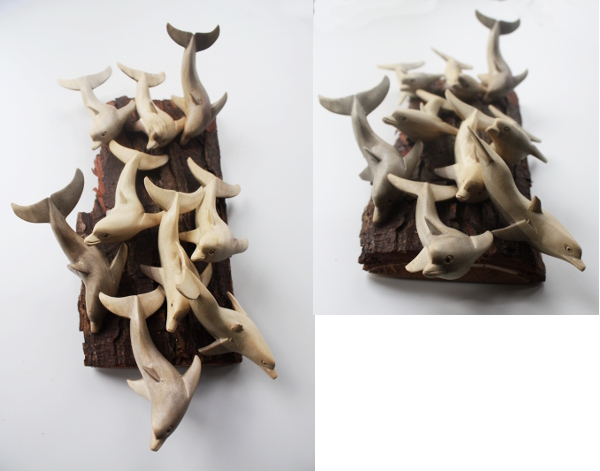 Houten wand en tafel decoratie met dolfijnen.