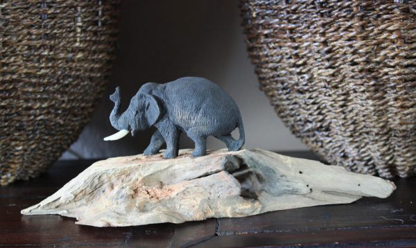 Olifant op hout. Het beeld is ongeveer 28,5 cm lang, 9 cm diep en 10 cm hoog.