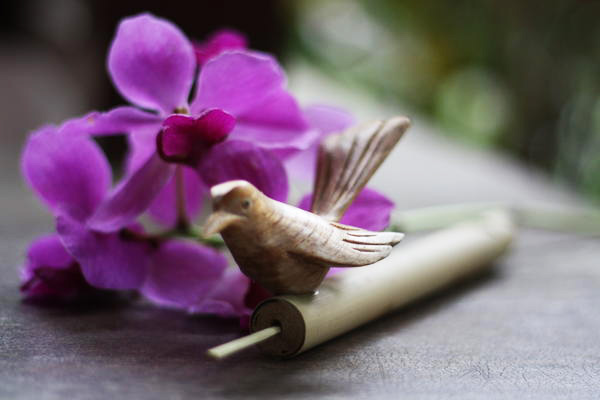 Dit leuke kleine vogelfluitje is met de hand van bamboe en hout gemaakt.