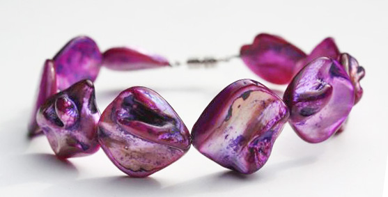 Armband van parelmoer kralen. De armband is ongeveer 22 cm lang en heeft een zilverkleurige draaisluiting.