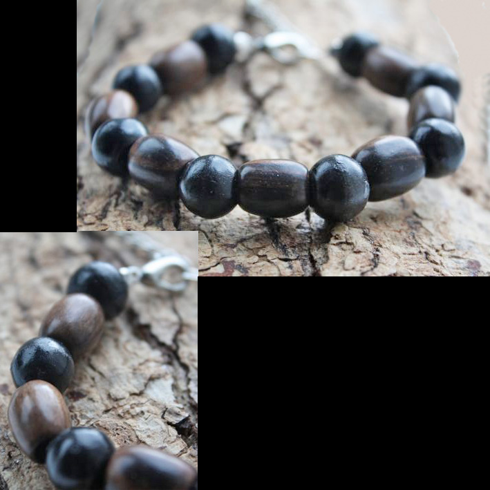 Deze mooie armband is gemaakt van donker bruine/zwarte mahonie houten en zwarte houten kralen. De armband is ongeveer 20 cm lang en heeft een verlengketting van circa 3 cm.