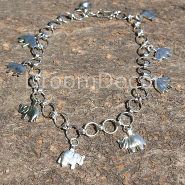 Deze schitterende grove enkel ketting is voorzien van diverse olifanten en belletje. De enkelketting is ongeveer 27,5 cm lang en is op elke gewenste lengte te sluiten.