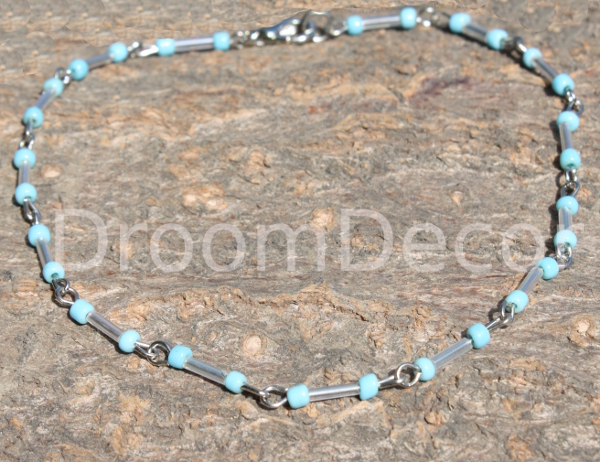 Enkel kettinkje met blauwe kraaltjes en glazen pijpjes van circa 28 cm lang. De enkel ketting is voorzien van een zilverkleurige sluiting.