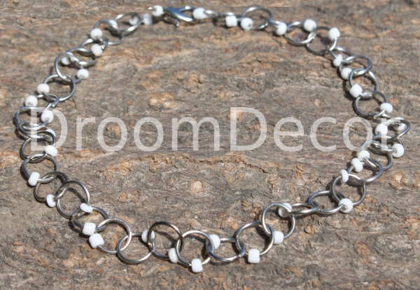 Enkel kettinkje met schakels en witte kraaltjes. De enkelketting is circa 27 cm lang en is voorzien van een zilverkleurige sluiting.