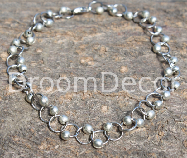 Enkel kettinkje met schakels en zilverkleurige kraaltjes van circa 26 cm lang. De enkel ketting is voorzien van een zilverkleurige sluiting.