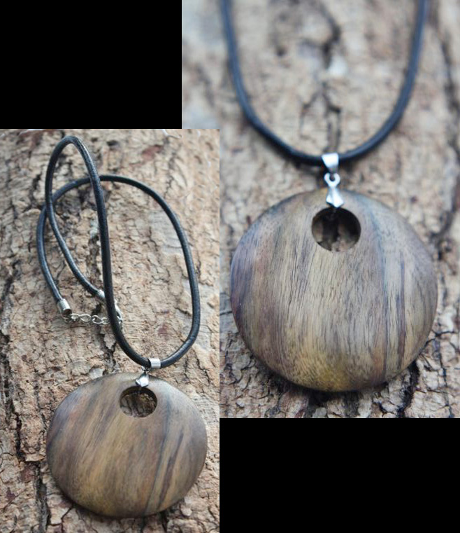 Ketting met houten hanger met gat. De ketting is ongeveer 43 cm lang, de hanger heeft een doorsnee van 5,5 cm en de ketting heeft een verlengketting van circa 3,5 cm.