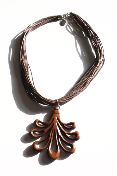 De ketting is gemaakt van diverse touwtjes, met daaraan de houten met de hand gesneden hanger.