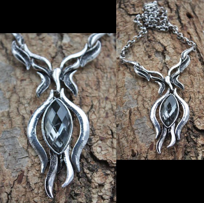Deze ketting is gemaakt van metaal en een ingezette grijze geslepen steen. De ketting is ongeveer 53 cm lang en kan op elke gewenst lengte worden gesloten.
