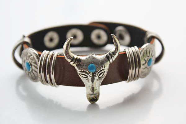 Leren armband. De armband is ongeveer 23 cm lang en 1,5 cm breed, de ram is 3,5 cm breed.