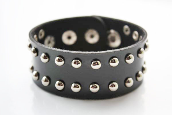 Leren armband met studs. De armband is ongeveer 3 cm breed en 22,5 cm lang.