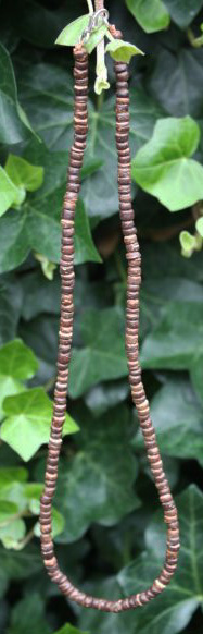Deze ketting is gemaakt van donker houten kralen. De ketting is ongeveer 54 cm lang en is voorzien van een zilverkleurige sluiting.