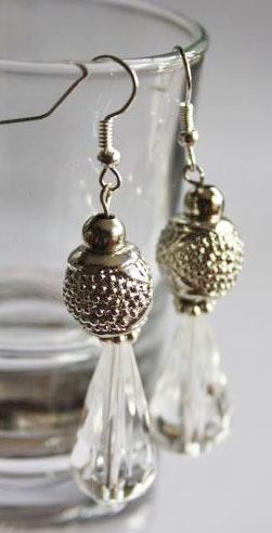 Deze mooie en unieke oorbellen zijn van zware zilverkleurige en glasheldere kralen gemaakt. De oorbellen hebben een chique uitstraling Ze zijn ongeveer 6,5 cm lang.