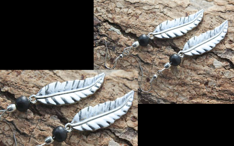 Deze oorbellen zijn gemaakt van houten kralen en metalen veren.