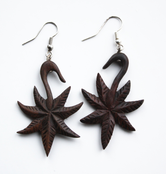 Met de hand gemaakte houten oorbellen. De oorbellen zijn ongeveer 6.5 cm lang.