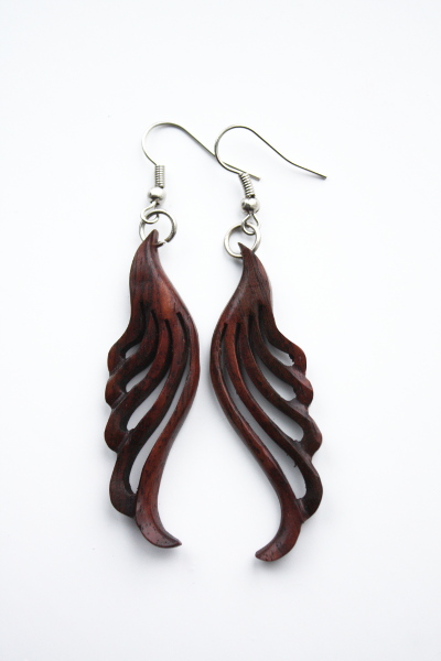 Met de hand gemaakte houten oorbellen. De oorbellen zijn ongeveer 7 cm lang.