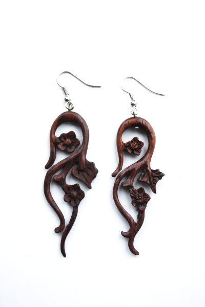Met de hand gemaakte houten oorbellen. De oorbellen zijn ongeveer 8 cm lang.
