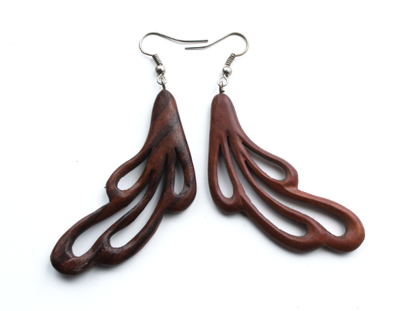Met de hand gemaakte houten oorbellen. De oorbellen zijn ongeveer 8 cm lang.