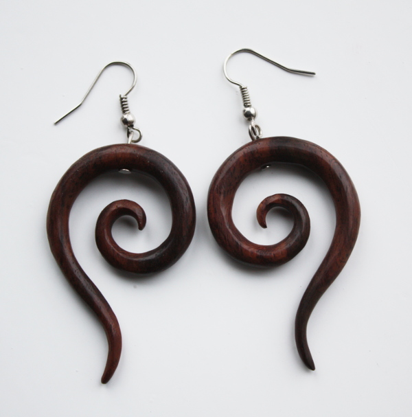 Met de hand gemaakte houten oorbellen. De oorbellen zijn ongeveer 7 cm lang.