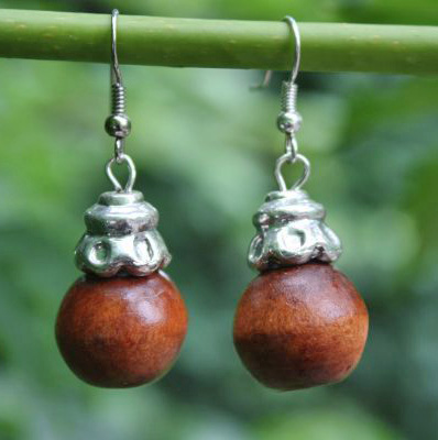 Schitterende oorbellen met houten kralen en zilver kleurige kappen. De oorbellen zijn ongeveer 4 cm lang.