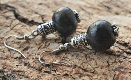 Set oorbellen van hout en metaal. De kappen zijn bij dit model bewerkt. De oorbellen zijn ongeveer 4,5 cm lang.