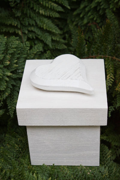 Houten urn van mango wood in de kleur White wash geschilderd, met op de deksel een houten hart. Ze is ongeveer 12 cm hoog, 10,5 breed en 10,5 cm diep.Inhoud: ongeveer 550 ml.