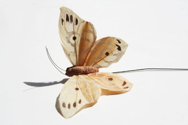 Deze luxe vlinder is van veren gemaakt. De vlinder is circa 10 cm breed en 7,5 cm lang. De ijzeren pin waarmee u de vlinder ergens in kunt steken is ongeveer 12 cm lang.