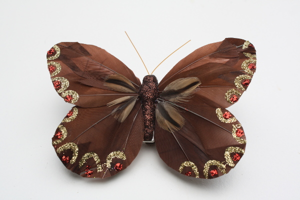 Deze veren vlinder is ongeveer 12,5 cm breed en 8 cm lang. De vlinder aan de randen versierd met gouden en rode glitters.