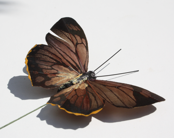 Deze veren vlinder 9 cm breed en 5 cm lang. De vlinder is op een ijzeren pin bevestigd.