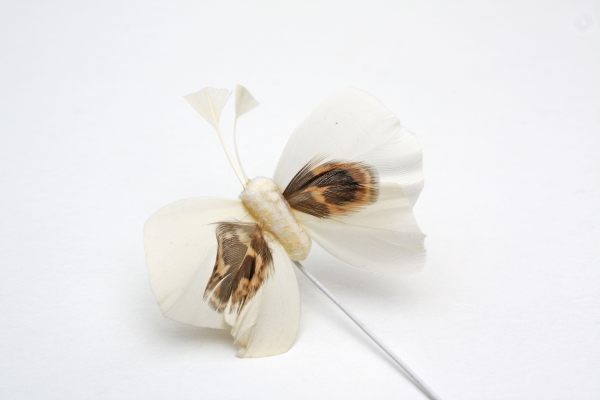 Deze leuke kleine vlinder is van echte veren gemaakt. De vlinder is ongeveer 6 cm breed en 5 cm lang. Het pinnetje waar de vlinder aan zit is ongeveer 13 cm lang.