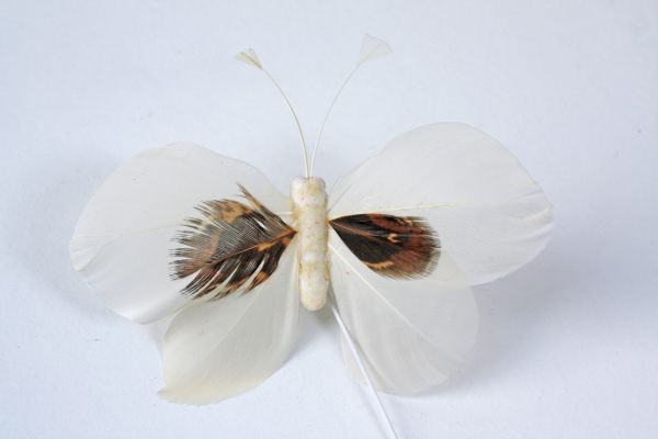 Deze mooie vlinder is van echte veren gemaakt.