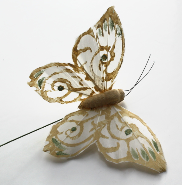 Veren vlinder van ongeveer 9 cm breed en 7 cm lang. De veren vlinder is aan de achterkant verstevigend en staat op een ijzeren pin van circa 12 cm lang.
