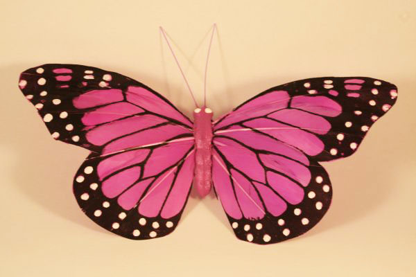 Deze grote luxe vlinder is van veren gemaakt, uitgevoerd in een paarse kleur. De vlinder is circa 15,5 cm breed en 7 cm lang. De vlinder is aan de achterzijde voorzien van een ijzeren klip.