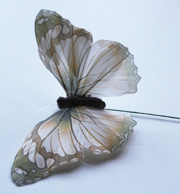 Deze luxe vlinder is van veren gemaakt. De vlinder is circa 11 cm breed en 6.5 cm lang. De ijzeren pin waarmee u de vlinder ergens in kunt steken is ongeveer 10 cm lang.