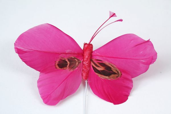 Deze mooie vlinder is van echte veren gemaakt. De veren vlinder is ongeveer 8 cm breed en 8 cm lang. De ijzeren pin waar de vlinder op is gestoken is ongeveer 19 cm lang.