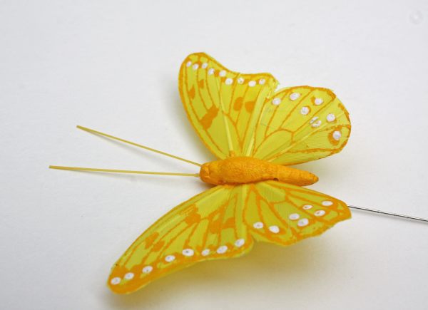 Deze luxe vlinder is van veren gemaakt. De vlinder is circa 9 cm breed en 6 cm lang. De ijzeren pin waarmee u de vlinder ergens in kunt steken is ongeveer 10 cm lang.