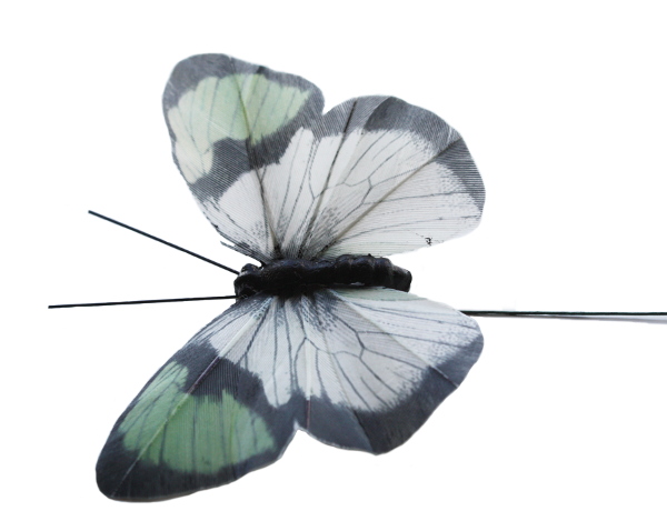Deze veren vlinder 9 cm breed en 7 cm lang. De vlinder is op een ijzeren pin van circa 10 cm bevestigd.