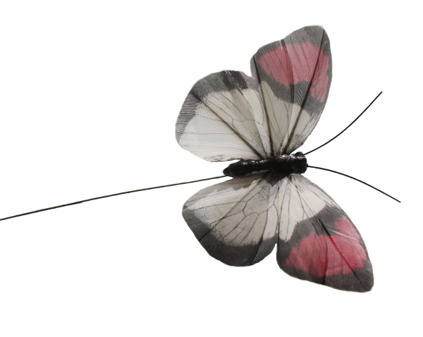 Deze veren vlinder 9 cm breed en 7 cm lang.