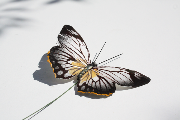 Deze veren vlinder 9 cm breed en 5 cm lang. De vlinder is op een ijzeren pin bevestigd.