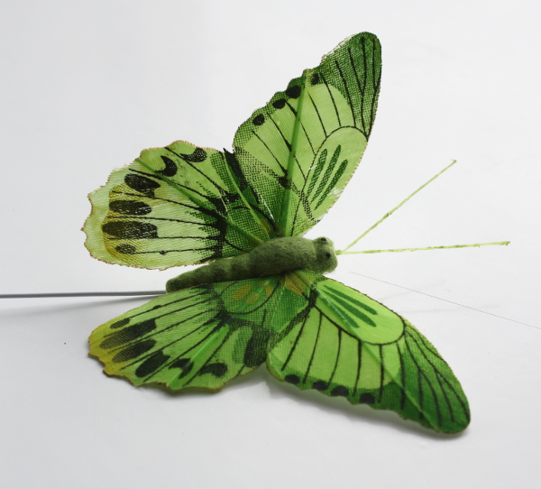 Veren vlinder van ongeveer 8 cm breed en 6.5 cm lang. De veren vlinder is aan de achterkant verstevigend en staat op een ijzeren pin van circa 11 cm lang.