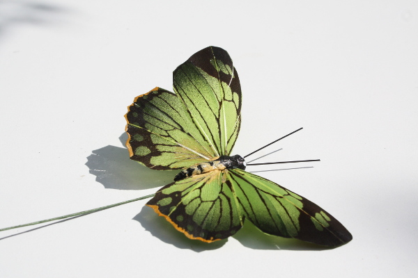 Deze veren vlinder 9 cm breed en 5 cm lang. De vlinder is op een ijzeren pin bevestigd.