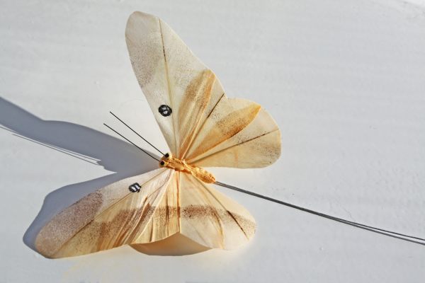 Deze grote luxe vlinder is van veren gemaakt. De vlinder is circa 12 cm breed en 9 cm lang. De vlinder is op een ijzeren draad van ongeveer 10 cm gemaakt, zodat u haar ergens aan kunt bevestigen.