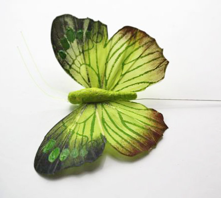 De vlinder is van echte veren gemaakt. De vlinder is circa 8.5 cm breed en 8 cm lang. De ijzeren pin waarmee u de vlinder ergens in kunt steken is ongeveer 9 cm lang.