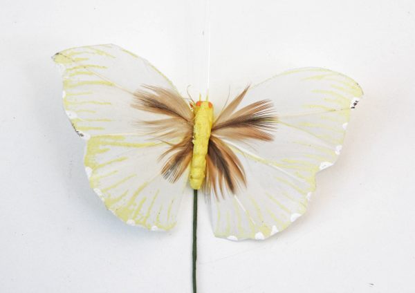 Deze fraaie vlinder is van echte veren gemaakt. Hij is ongeveer 8,5 cm breed en 4,5 cm lang. De vlinder heeft aan de achterzijde een ijzeren pin van circa 10 cm lang.