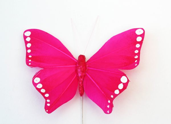 Deze luxe vlinder is van veren gemaakt. De vlinder is circa 10,5 cm breed en 9 cm lang. De ijzeren pin waarmee u de vlinder ergens in kunt steken is ongeveer 8,5 cm lang.