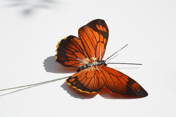 Deze veren vlinder 9 cm breed en 5 cm lang. De vlinder is op een ijzeren pin bevestigd.