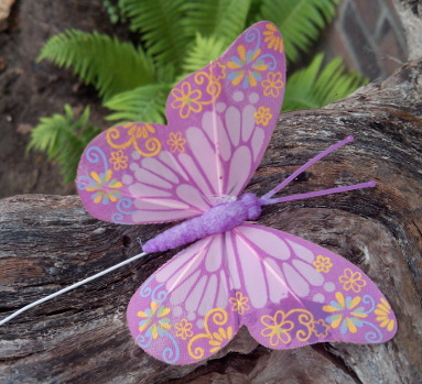 Deze mooie vlinder is van echte veren gemaakt. De veren vlinder is ongeveer 7.5 cm breed en 7 cm lang. De ijzeren pin waar de vlinder op is gestoken is ongeveer 15 cm lang.