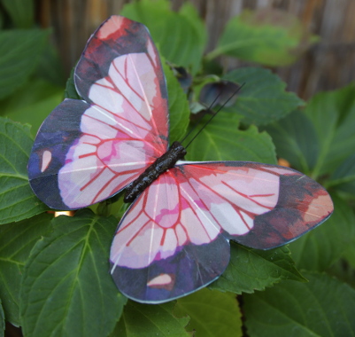 De vlinder is op een ijzeren draad van ongeveer 10 cm gemaakt, zodat u haar ergens aan kunt bevestigen.