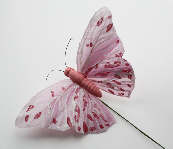 Deze luxe vlinder is van veren gemaakt. De vlinder is circa 11 cm breed en 7 cm lang. De ijzeren pin waarmee u de vlinder ergens in kunt steken is ongeveer 12 cm lang.