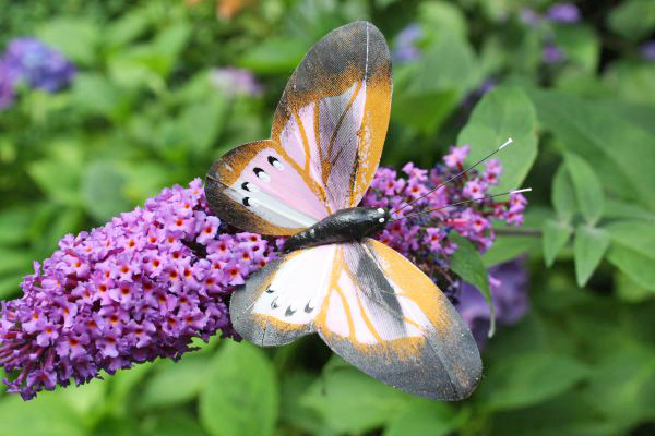 Deze luxe vlinder is van veren gemaakt, uitgevoerd in een bruin, roze en witte kleur. De vlinder is circa 10 cm breed en 8 cm lang. De ijzeren pin waarmee u de vlinder ergens in kunt steken is ongeveer 9,5 cm lang.