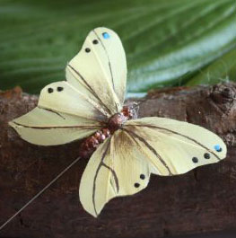 Deze luxe vlinder is van veren gemaakt, uitgevoerd in een gele kleuren. De vlinder is circa 6,5 cm breed en 5 cm lang. De ijzeren pin waarmee u de vlinder ergens in kunt steken is ongeveer 9 cm lang.